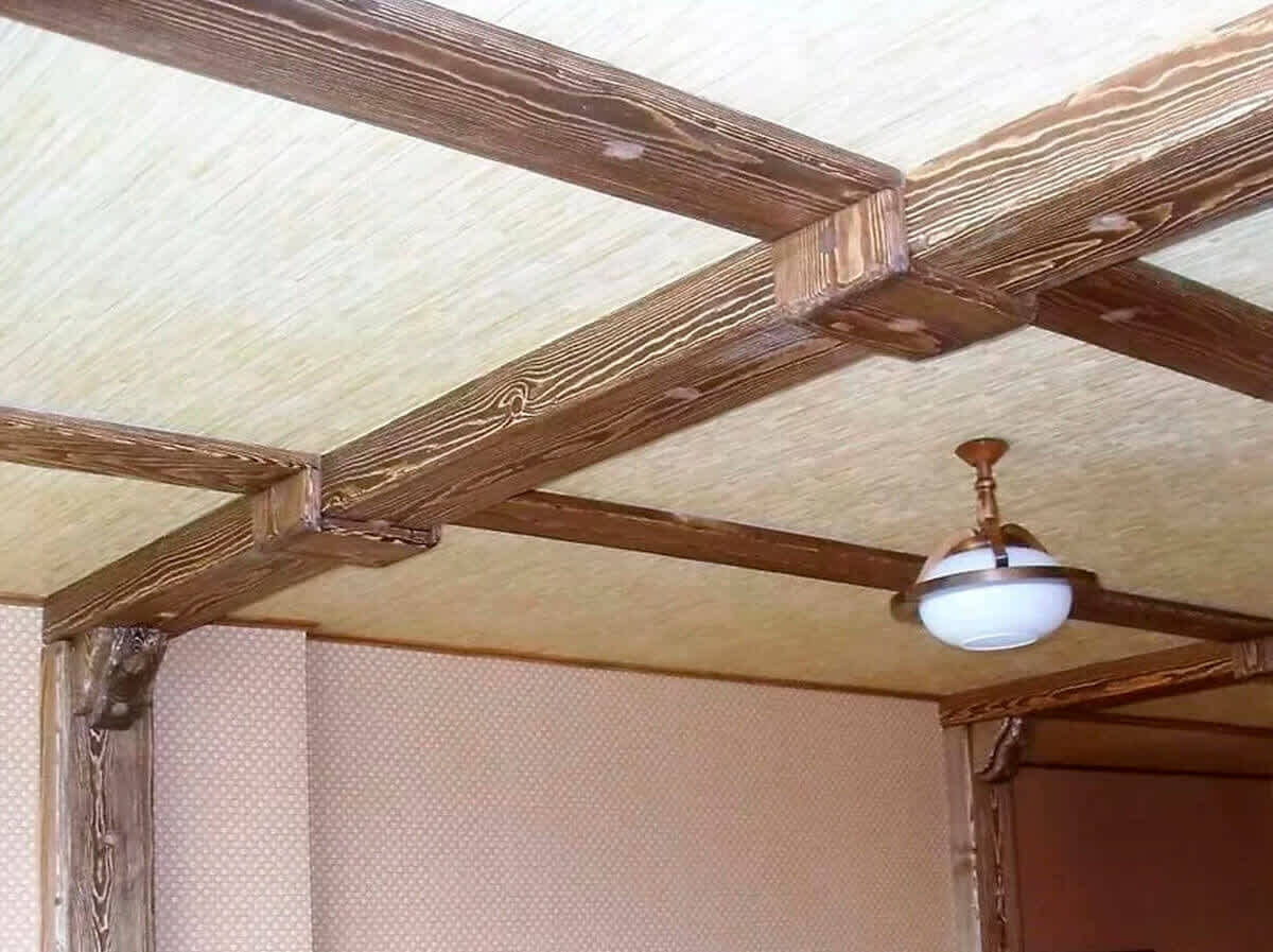 Наиболее популярной дополнительной декоративной обработкой для потолочных балок является искусственное состаривание (древесина брашируется и на неё наносится патина) или тонирование (красим в любой цвет). Дополненные декоративными тросами или цепями, такие потолочные балки придадут помещению солидный и респектабельный вид.